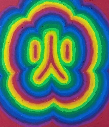 This painting can seem like several things at once; the morning sun rising over the ocean, or an eyeball peering into the universe, or the emanation of a smiling face.