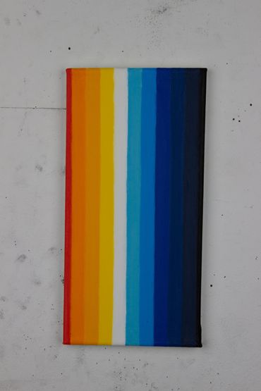 Rainbow colors follow gravity as they interact with notions of the sun and earth. A vibrant and enticing piece that rings with joy.